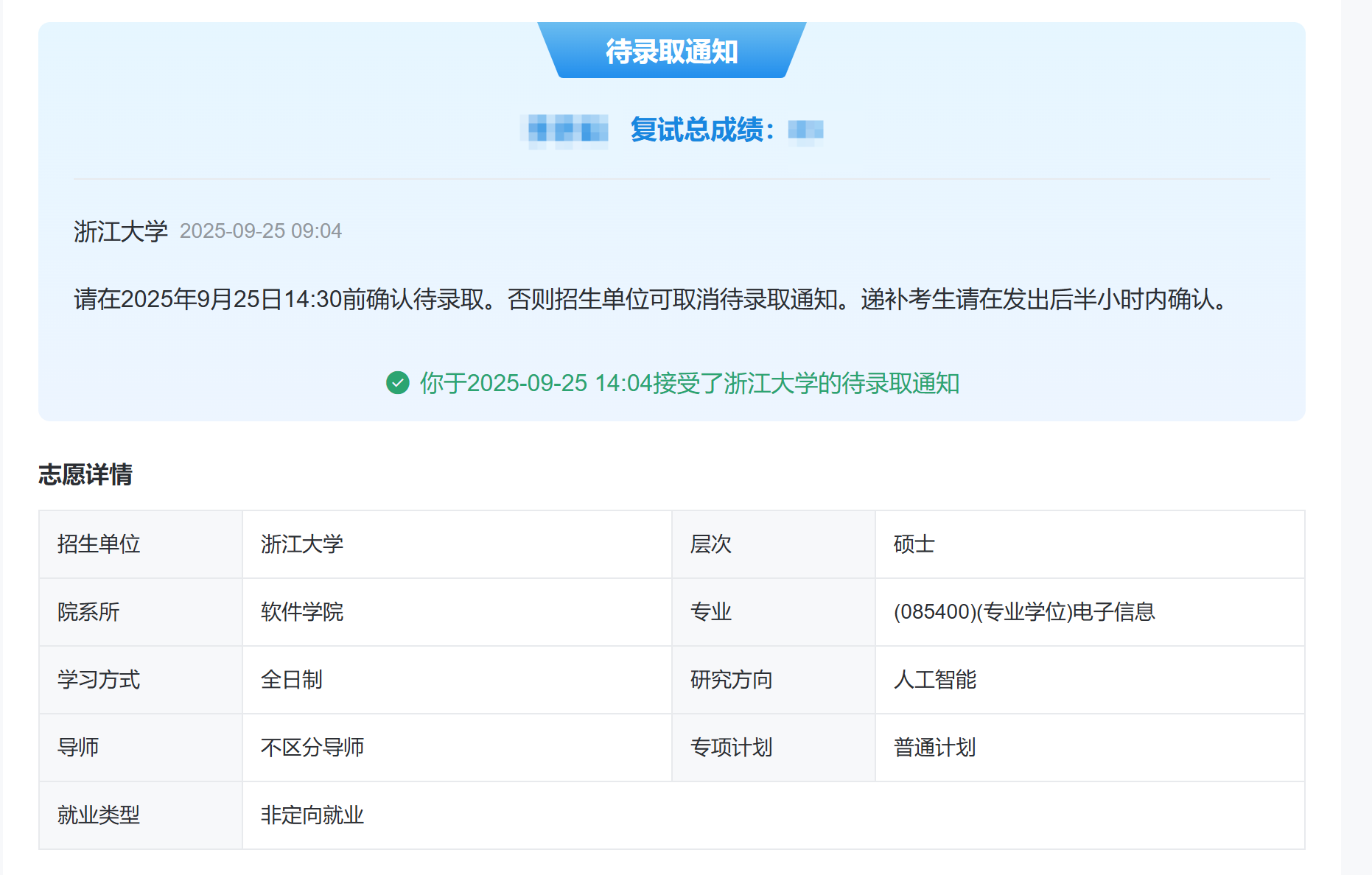 浙大 | 软件学院 | √ | √ | 最终去向,高位拟录取(总分前25名) |