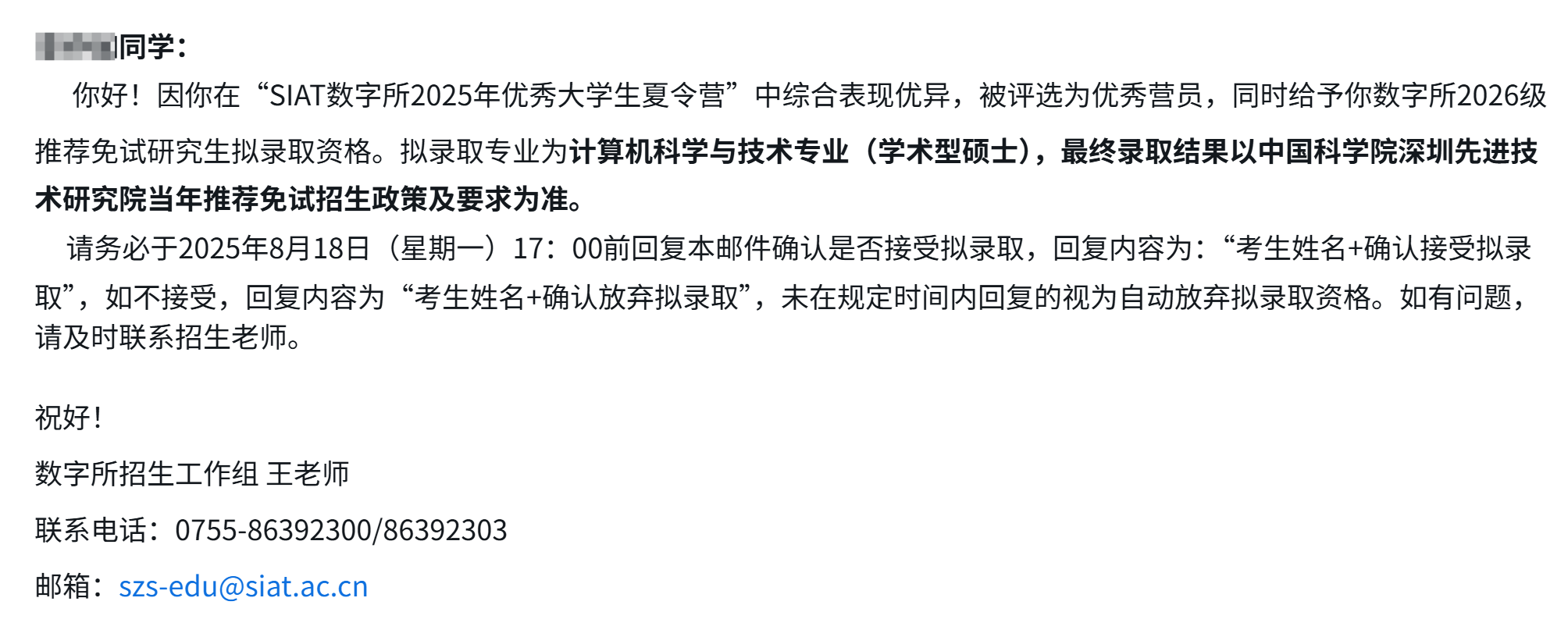 数字所的面试和杭高院非常相似,但是严格限时10分钟每个人,也是基本的英语自我介绍、PPT陈述、项目问答。可能在深圳的原因,老师对我腾讯的实习经历很感兴趣,问了好几个实习相关的问题hhh。8月中旬左右,我也是收到了数字所的学硕拟录取,当时非常开心,甚至一度最后想去这里,因为据说只发了10多个offer,而且排名非常靠前的同学才能拿到学硕。