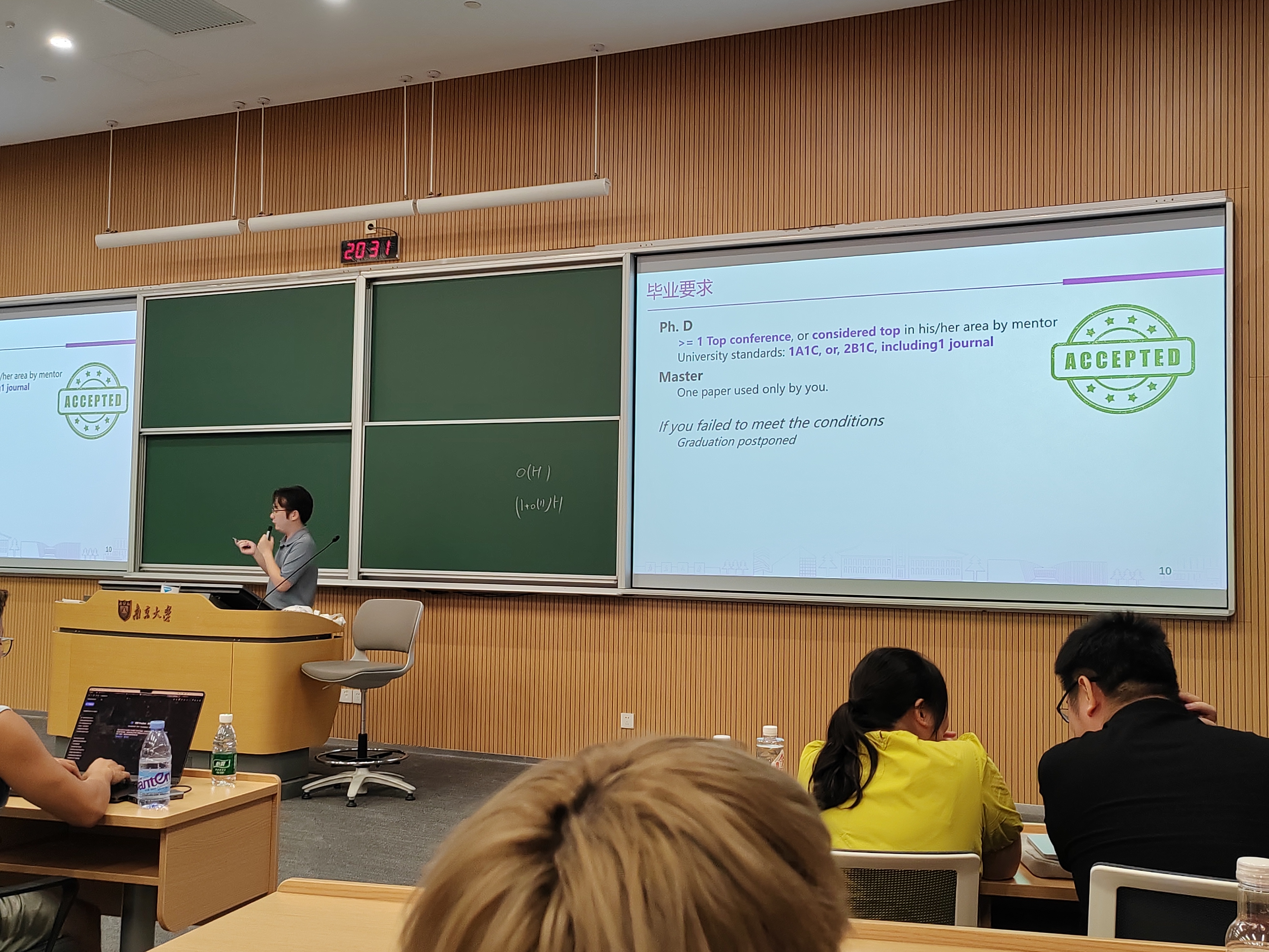 7.23下午在南苏找了半天,终于找到了南雍楼,赶在16:30见面会开始时卡点到了教室。南大智软的教务说今年入营的bar很高,总共76人入营,有近50位本院同学,外校基本是江苏本地合作211高校和其他985 rk1入营(也暗示了入营了大部分最后都能录上,因为鸽子多)。