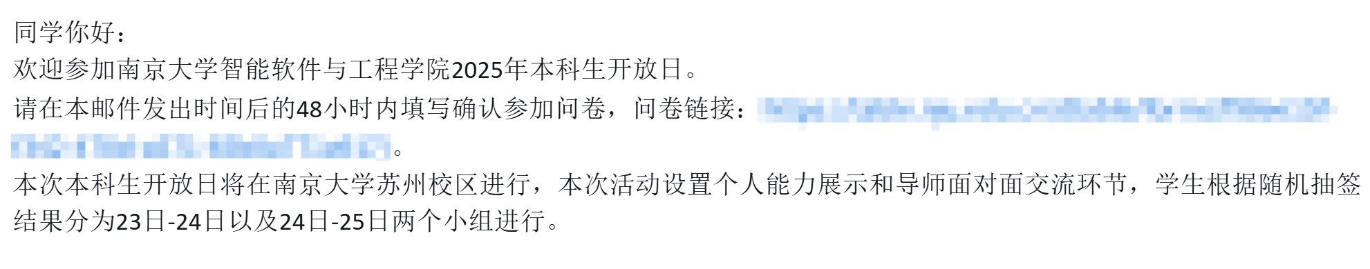 收到智软的入营是7.18下午(去合肥的前一天),当时非常高兴,因为身边没有其他同学入营,感觉bar应该不低。发现智软和科学岛很可能撞上(如果抽到23-24就是必撞),于是填问卷的时候备注里请求分到24-25,教务林老师很给力!最终分到了24-25组,感谢林老师!