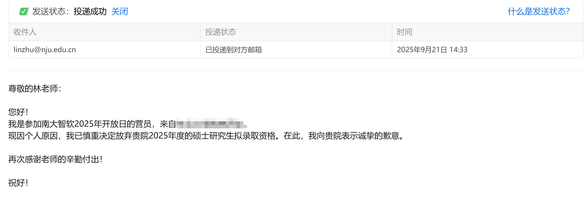 9.20上午南大智软的教务打电话让我再次确认意向。下午知道自己稳了后,我第一时间释放了南大的offer,并鸽了南大这位非常好的老师(非常非常对不起您!),当时是真难受了很久,真心希望这位老师能够找到比我更好的人选!!